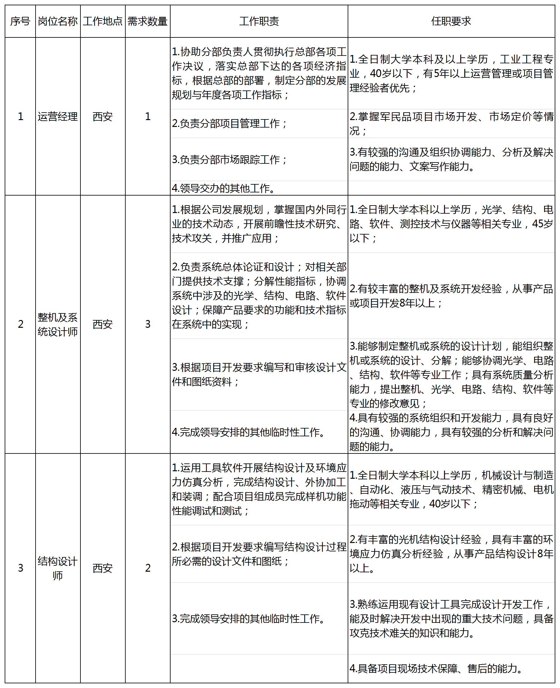 四川長(zhǎng)虹電子科技有限公司(國(guó)營(yíng)第七八〇廠)始建于1958年,是國(guó)家“一五”期間的156個(gè)重點(diǎn)項(xiàng)目之一,是我國(guó)第一個(gè)機(jī)載火控雷達(dá)科研生產(chǎn)基地,位于綿陽(yáng)市經(jīng)濟(jì)技術(shù)開發(fā)區(qū)。公司注冊(cè)資本1.7億元人民幣,為國(guó)有獨(dú)資企業(yè)。公司擁有完備的軍工科研生產(chǎn)資質(zhì),以高端光電儀器和高端光電裝備為主線,主要從事重力測(cè)量、光電探測(cè)和光電告警領(lǐng)域產(chǎn)品研發(fā)和生產(chǎn)。因業(yè)務(wù)發(fā)展需要,現(xiàn)誠(chéng)聘英才,招聘崗位及要求如下: