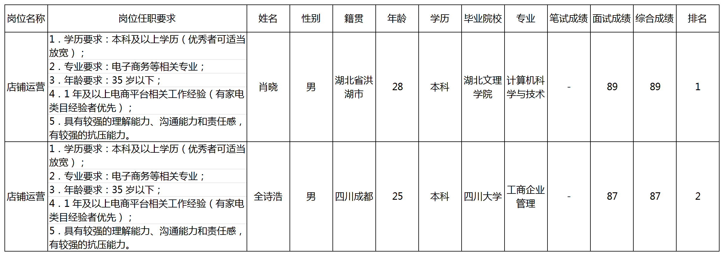 根據(jù)四川智易家網(wǎng)絡(luò)科技有限公司(長(zhǎng)虹·美菱中國(guó)區(qū))發(fā)布的招聘公告及招聘相關(guān)規(guī)定,經(jīng)初試、復(fù)試等程序,現(xiàn)將面試成績(jī)予以公示。