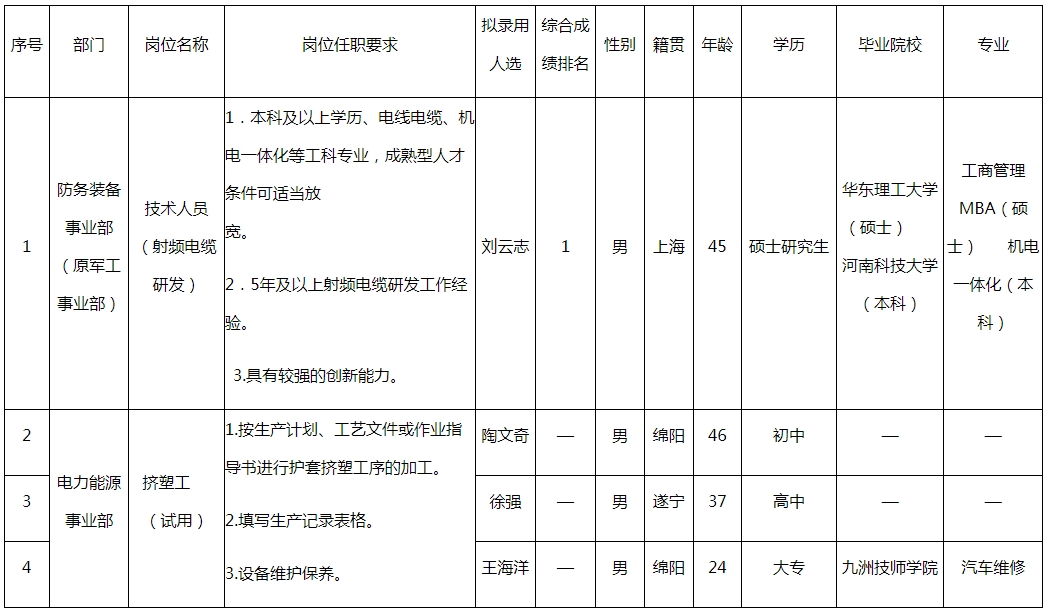 根據(jù)四川九洲線纜有限責(zé)任公司發(fā)布的招聘公告及招聘相關(guān)規(guī)定,經(jīng)面試、考察、體檢等程序,擬錄用劉云志等同志到四川九洲線纜有限責(zé)任公司工作,現(xiàn)予以公示,具體情況如下: