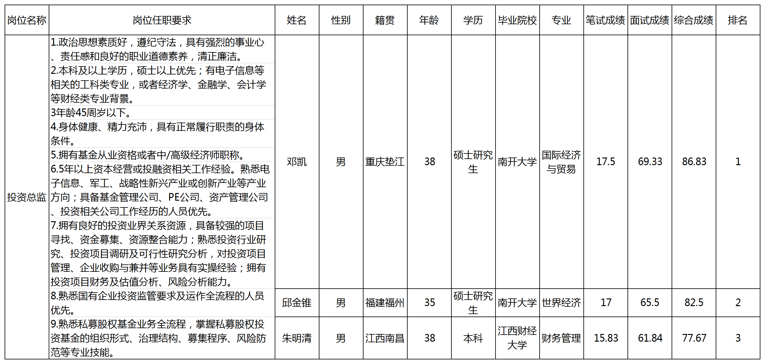 根據(jù)四川九洲創(chuàng)業(yè)投資有限責任公司發(fā)布的招聘公告及招聘相關(guān)規(guī)定,經(jīng)筆試、面試等程序,現(xiàn)將筆試(面試)成績予以公示。