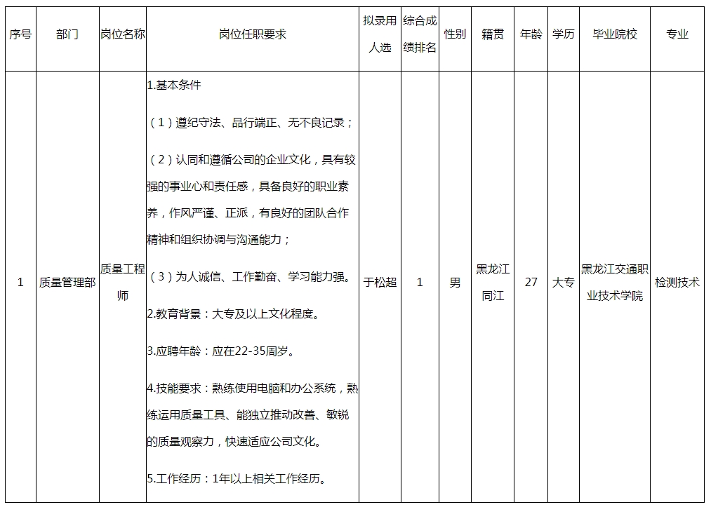 根據(jù)四川九州光電子技術(shù)有限公司發(fā)布的招聘公告及招聘相關(guān)規(guī)定,經(jīng)面試、考察、體檢等程序,擬錄用于松超同志到四川九州光電子技術(shù)有限公司工作,現(xiàn)予以公示,具體情況如下: