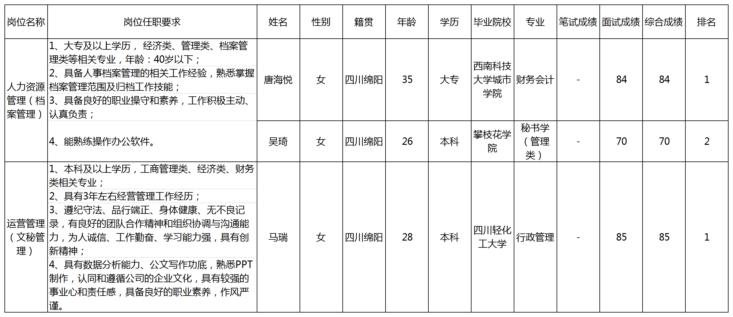 根據(jù)四川九州電子科技股份有限公司發(fā)布的招聘公告及招聘相關(guān)規(guī)定,經(jīng)筆試、面試等程序,現(xiàn)將筆試(面試)成績予以公示。