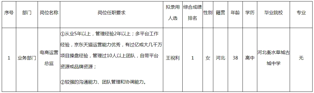 根據(jù)四川長虹佳華信息產(chǎn)品有限責(zé)任公司發(fā)布的招聘公告及招聘相關(guān)規(guī)定,經(jīng)面試、考察、體檢等程序,擬錄用王祝利同志到四川長虹佳華信息產(chǎn)品有限責(zé)任公司工作,現(xiàn)予以公示,具體情況如下: