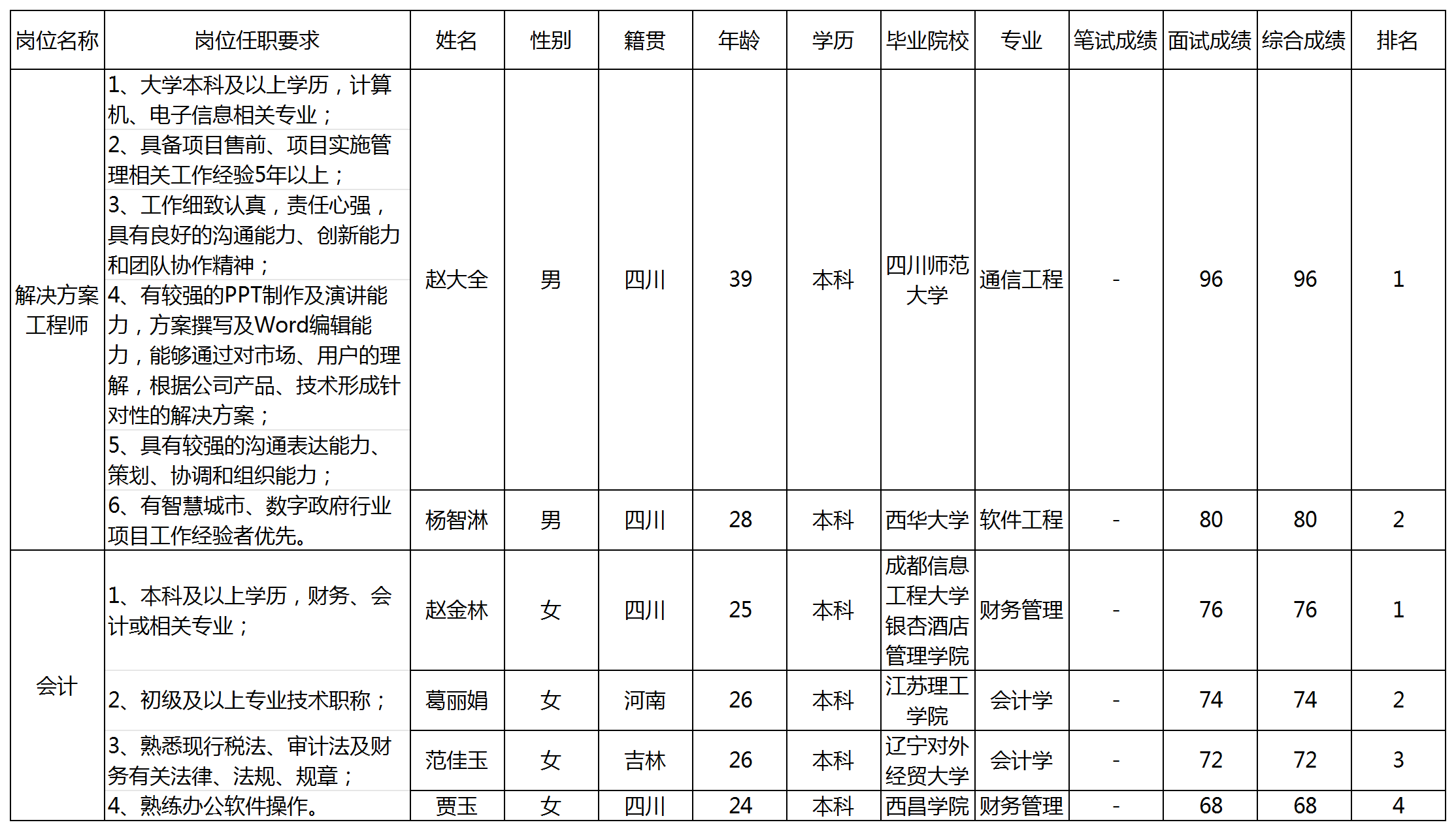 根據(jù)四川科瑞軟件有限責(zé)任公司發(fā)布的招聘公告及招聘相關(guān)規(guī)定,經(jīng)筆試、面試等程序,現(xiàn)將筆試(面試)成績予以公示。