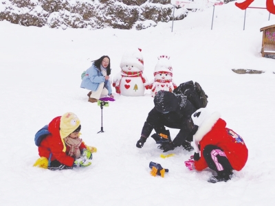 在北川,小朋友們在家長的陪伴下打雪仗、堆雪人。 (記者 李春梅 唐云峰 攝)