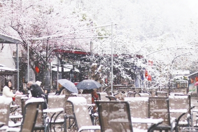 在三臺潼川古鎮(zhèn),人們在戶外賞雪?! ?三臺融媒記者 李春梅 唐云峰 攝)