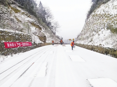 在擂鼓鎮(zhèn)擂禹路段,民警在重要路口設(shè)卡執(zhí)勤,引導(dǎo)群眾將車輛停放在山下的安全地點(diǎn)。在景家山路段,路面積雪較厚,民警在各路段有序開(kāi)展除雪防滑作業(yè),清掃路面積雪和冰塊。