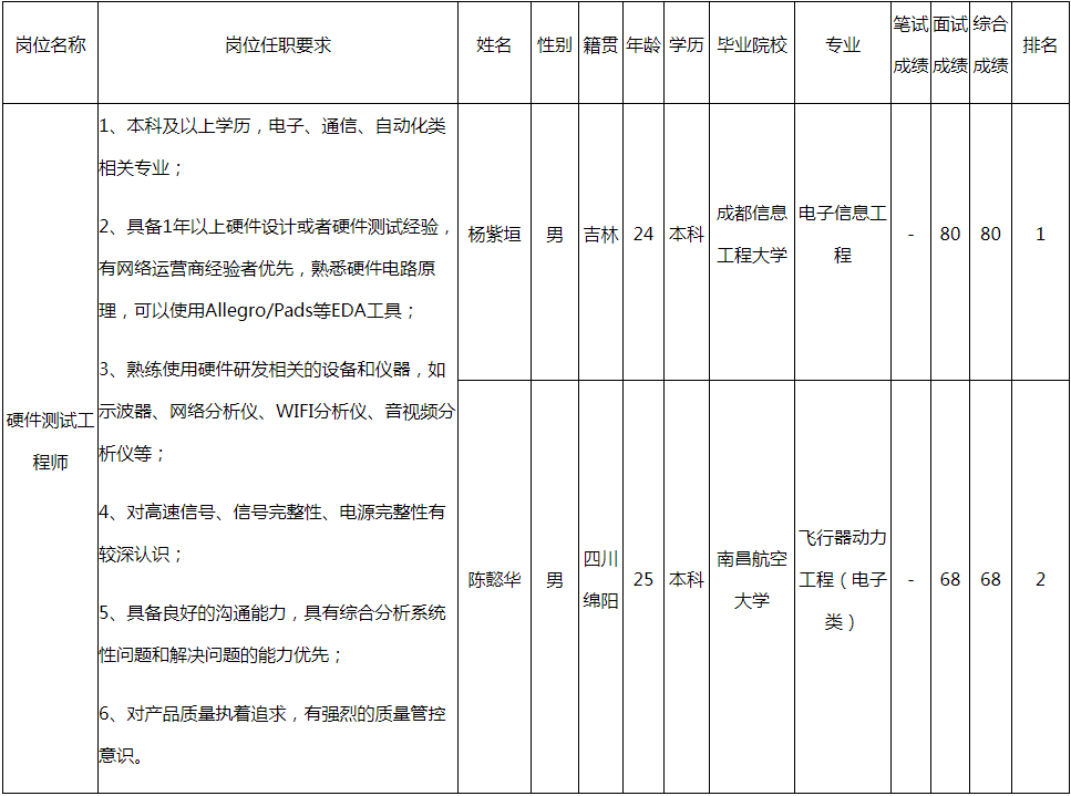 根據(jù)四川九州電子科技股份有限公司發(fā)布的招聘公告及招聘相關(guān)規(guī)定,經(jīng)筆試、面試等程序,現(xiàn)將筆試(面試)成績(jī)予以公示。