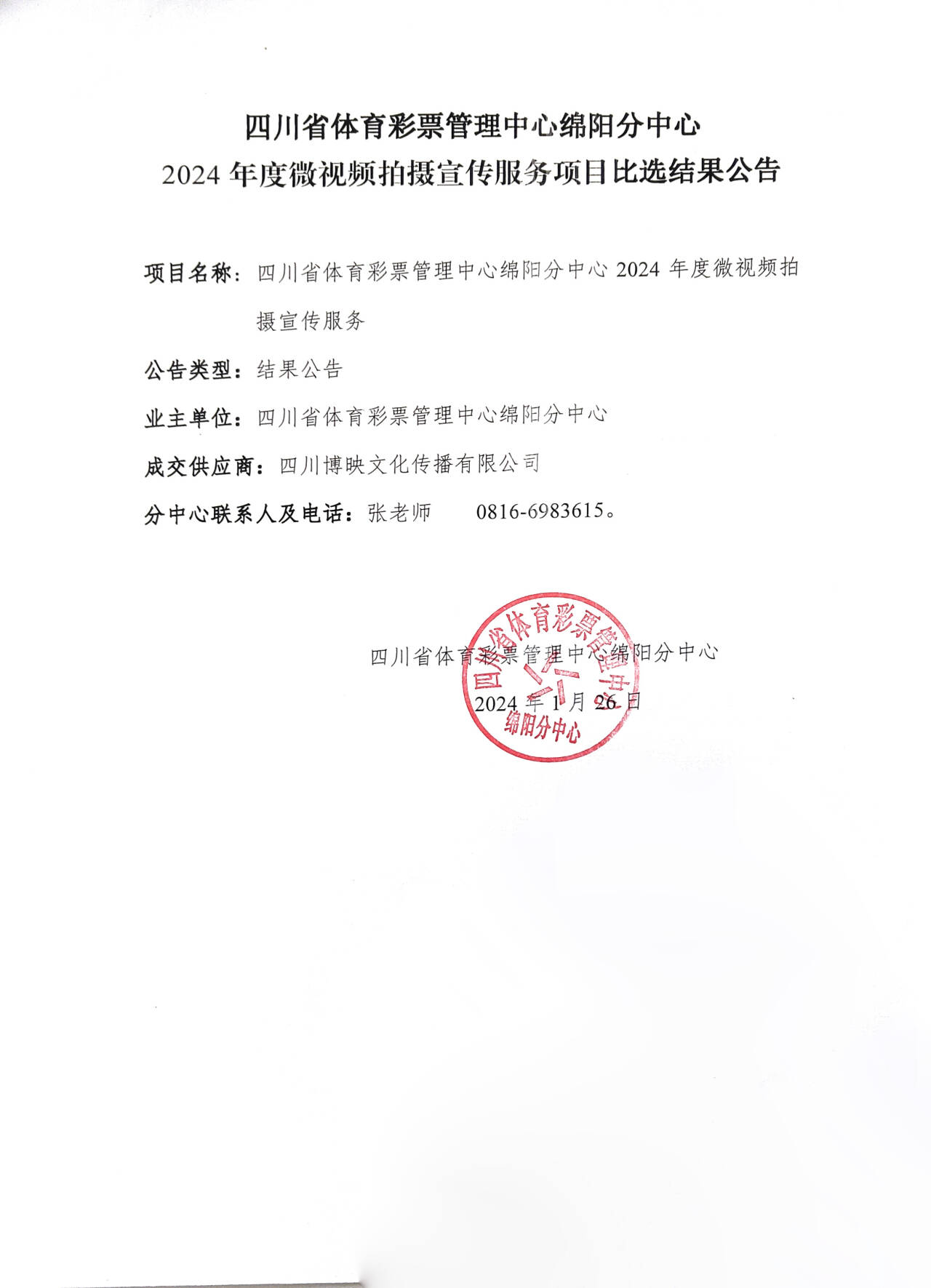 四川省體育彩票管理中心綿陽分中心2024年度微視頻拍攝宣傳服務項目比選結果公告