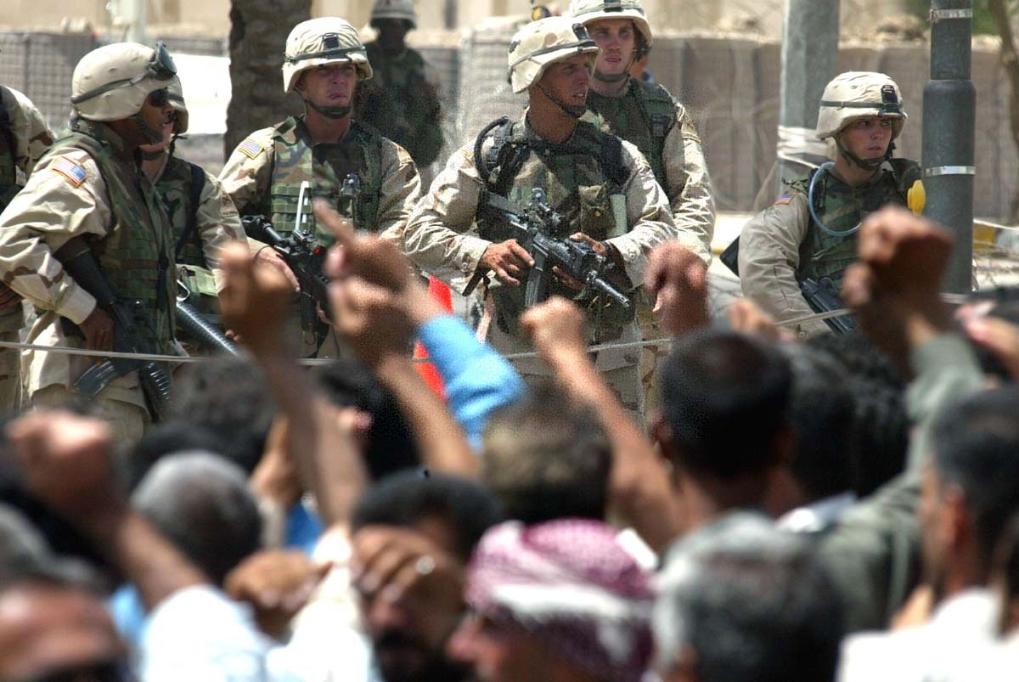 這是2003年6月18日,美軍士兵在伊拉克首都巴格達(dá)美英聯(lián)軍臨時總部門前持槍面對數(shù)百名示威的伊拉克人。新華社記者 趙建偉 攝
