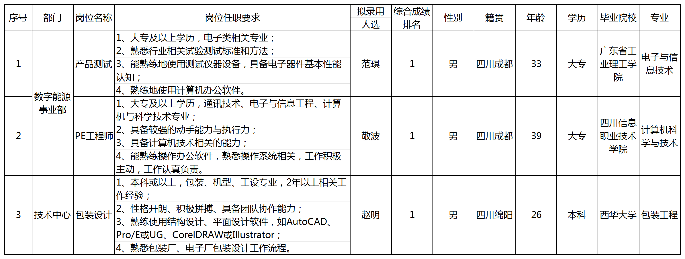 根據(jù)四川九州電子科技股份有限公司發(fā)布的招聘公告及招聘相關(guān)規(guī)定,經(jīng)筆試、面試、考察、體檢等程序,擬錄用范琪等3名同志到四川九州電子科技股份有限公司工作,現(xiàn)予以公示,具體情況如下: