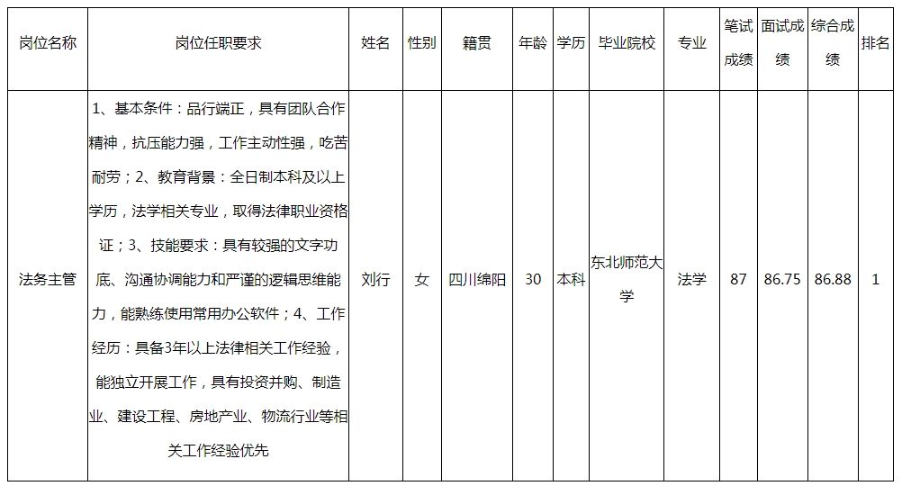 根據(jù)長(zhǎng)虹控股集團(tuán)發(fā)布的法務(wù)主管招聘公告及招聘相關(guān)規(guī)定,經(jīng)筆試、面試等程序,現(xiàn)將筆試(面試)成績(jī)予以公示。