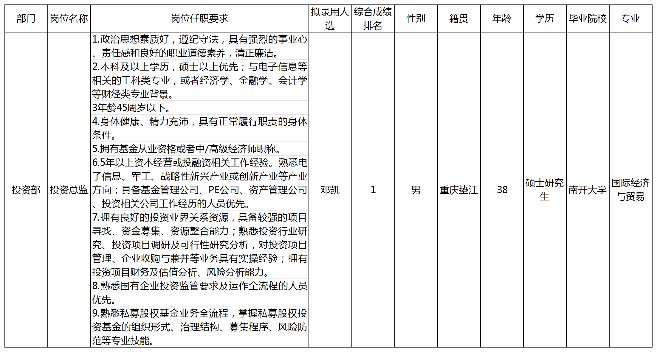 根據四川九洲創(chuàng)業(yè)投資有限責任公司發(fā)布的招聘公告及招聘相關規(guī)定,經筆試、面試、考察、體檢等程序,擬錄用鄧凱同志到四川九洲創(chuàng)業(yè)投資有限責任公司工作,現予以公示,具體情況如下: