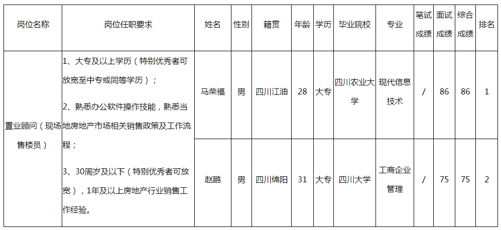 根據(jù)四川長虹置業(yè)有限公司發(fā)布的招聘公告及招聘相關(guān)規(guī)定,經(jīng)筆試、面試等程序,現(xiàn)將筆試(面試)成績予以公示。