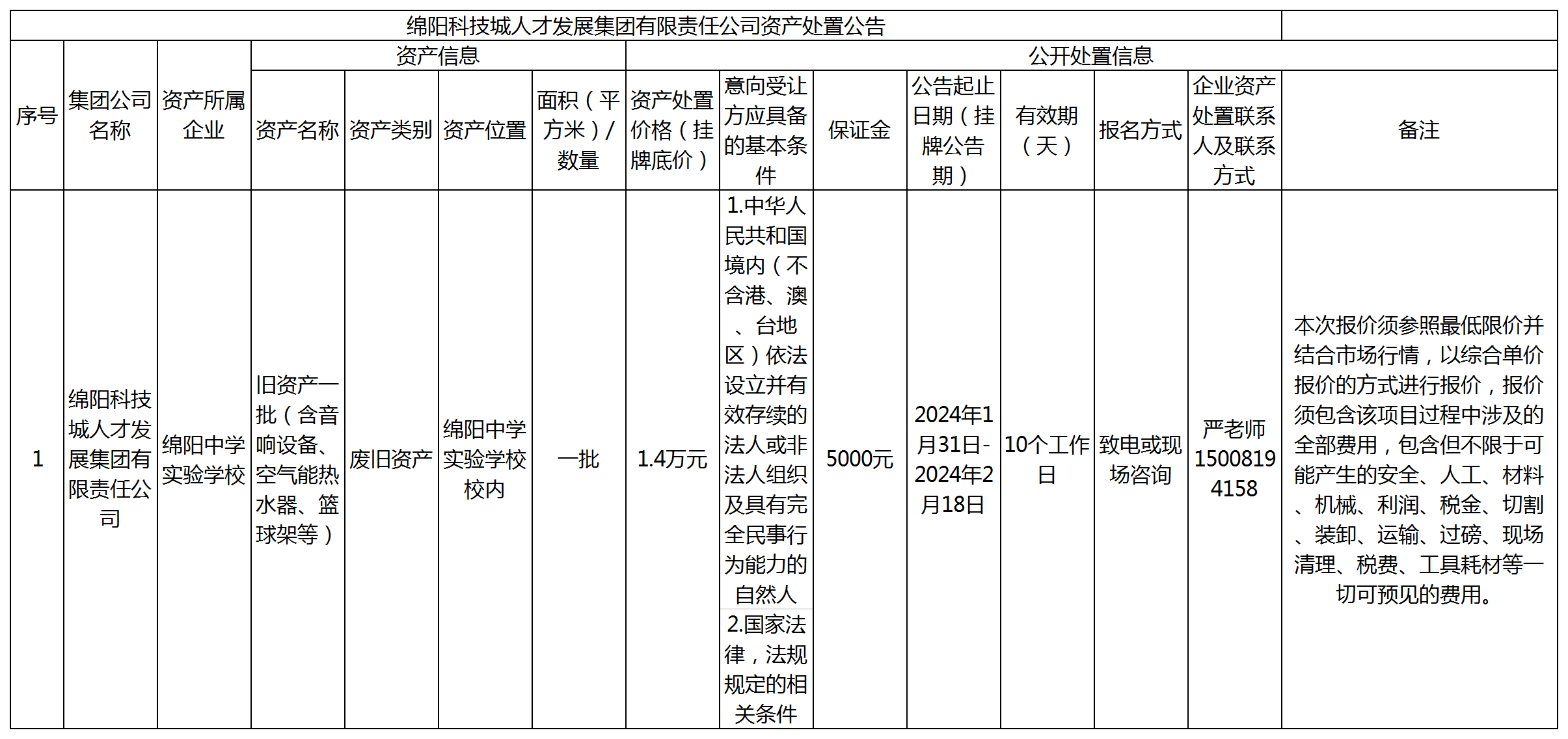綿陽科技城人才發(fā)展集團有限責任公司資產(chǎn)處置公告