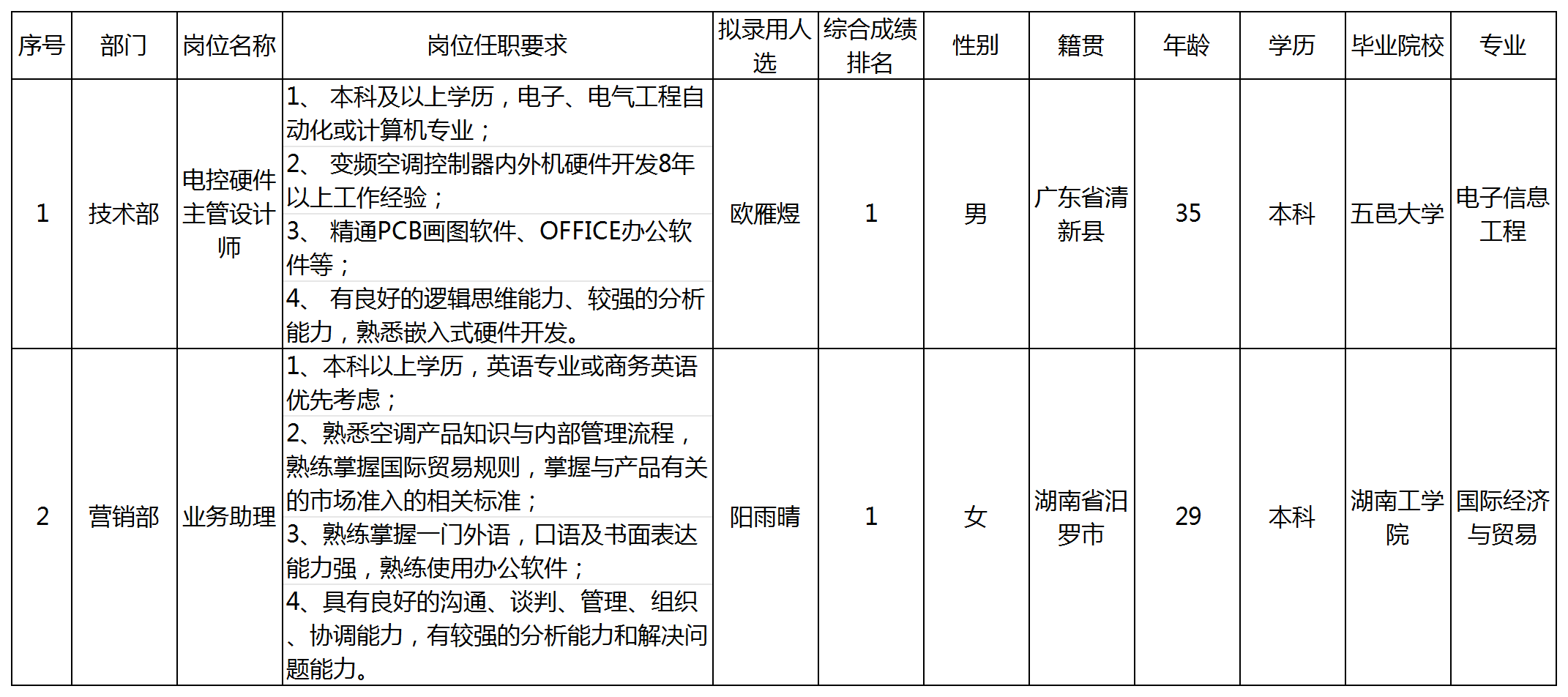 根據(jù)中山長虹電器有限公司發(fā)布的招聘公告及招聘相關(guān)規(guī)定,經(jīng)面試、考察、體檢等程序,擬錄用歐雁煜同志到電控硬件主管設(shè)計師工作,陽雨晴同志到業(yè)務(wù)助理崗位工作,現(xiàn)予以公示,具體情況如下: