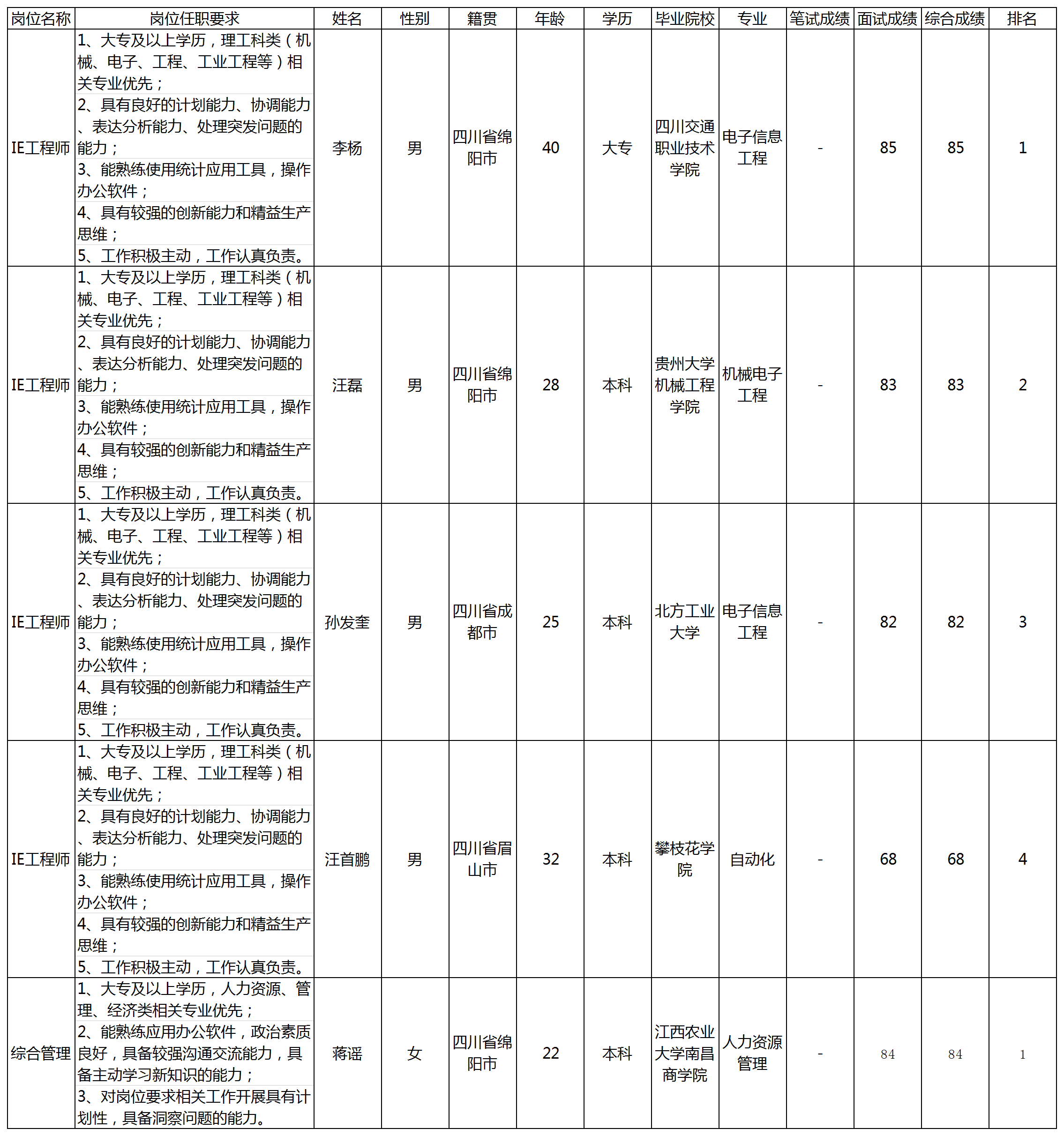 根據(jù)四川九州電子科技股份有限公司發(fā)布的招聘公告及招聘相關(guān)規(guī)定,經(jīng)筆試、面試等程序,現(xiàn)將筆試(面試)成績(jī)予以公示。