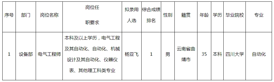 根據(jù)四川波鴻實(shí)業(yè)有限公司發(fā)布的招聘公告及招聘相關(guān)規(guī)定,經(jīng)面試,擬錄用楊亞飛為四川綿陽好圣汽車零部件制造有限公司電氣工程師,現(xiàn)予以公示,具體情況如下: