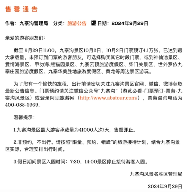 9月29日中午,九寨溝風(fēng)景名勝區(qū)管理局就發(fā)布公告稱,截至9月29日11:00,九寨溝景區(qū)10月2日、10月3日門票預(yù)訂4.1萬張,已達(dá)到最大承載量。九寨溝風(fēng)景名勝區(qū)管理局表示,九寨溝景區(qū)最大游客承載量為41000人次/天,售罄即止。