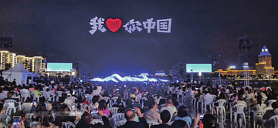 在涪城金西湖畔,無人機閃耀夜空,向祖國深情告白。(記者 任明勇 攝)