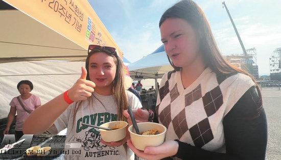 在第30屆國際南道飲食文化大盛宴上,外國友人品嘗綿陽美食后,連連稱贊。(記者 安崢 攝)