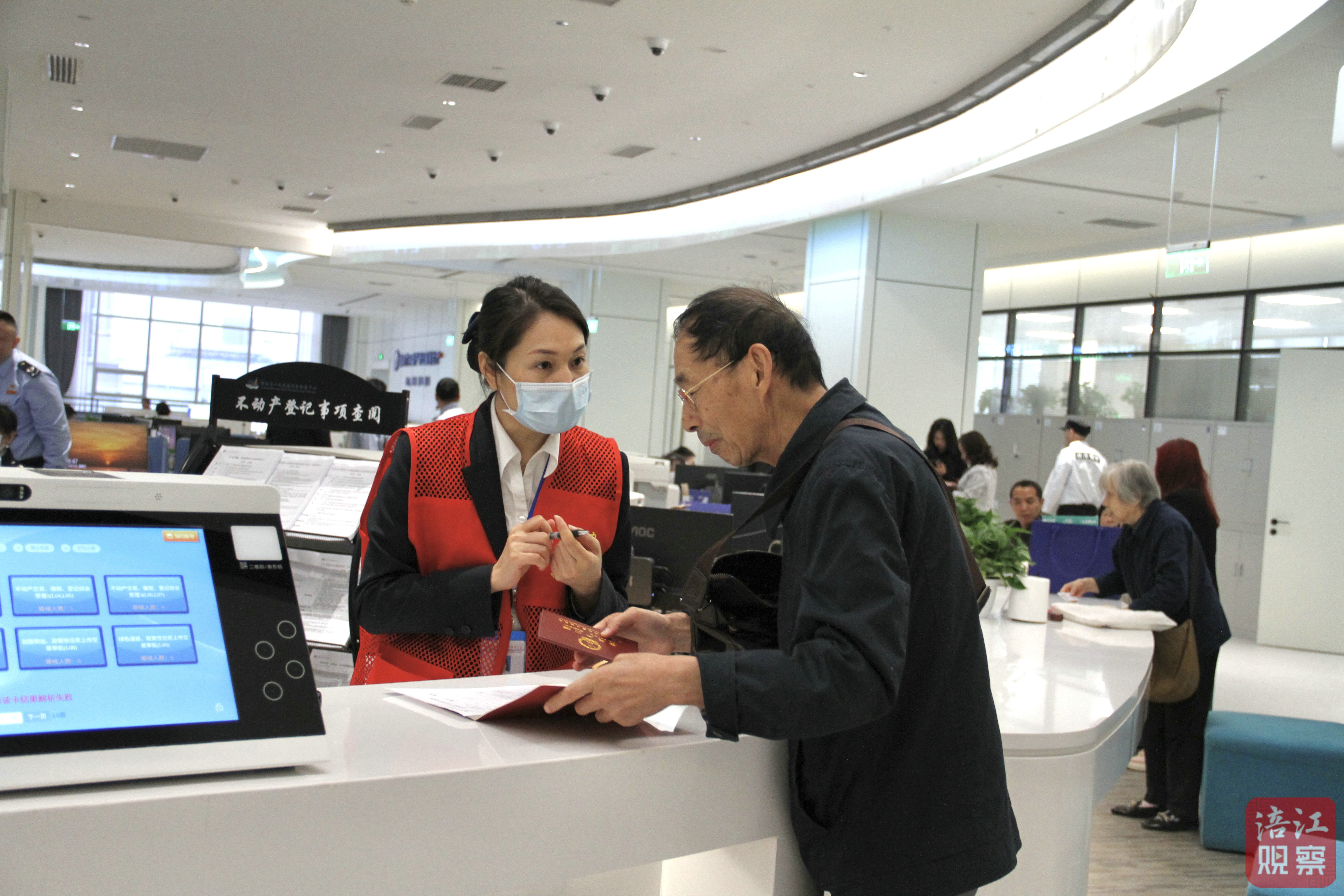 ★ 大廳里,不動產(chǎn)中心多名黨員先鋒隊成員,主動解答協(xié)助市民辦證。