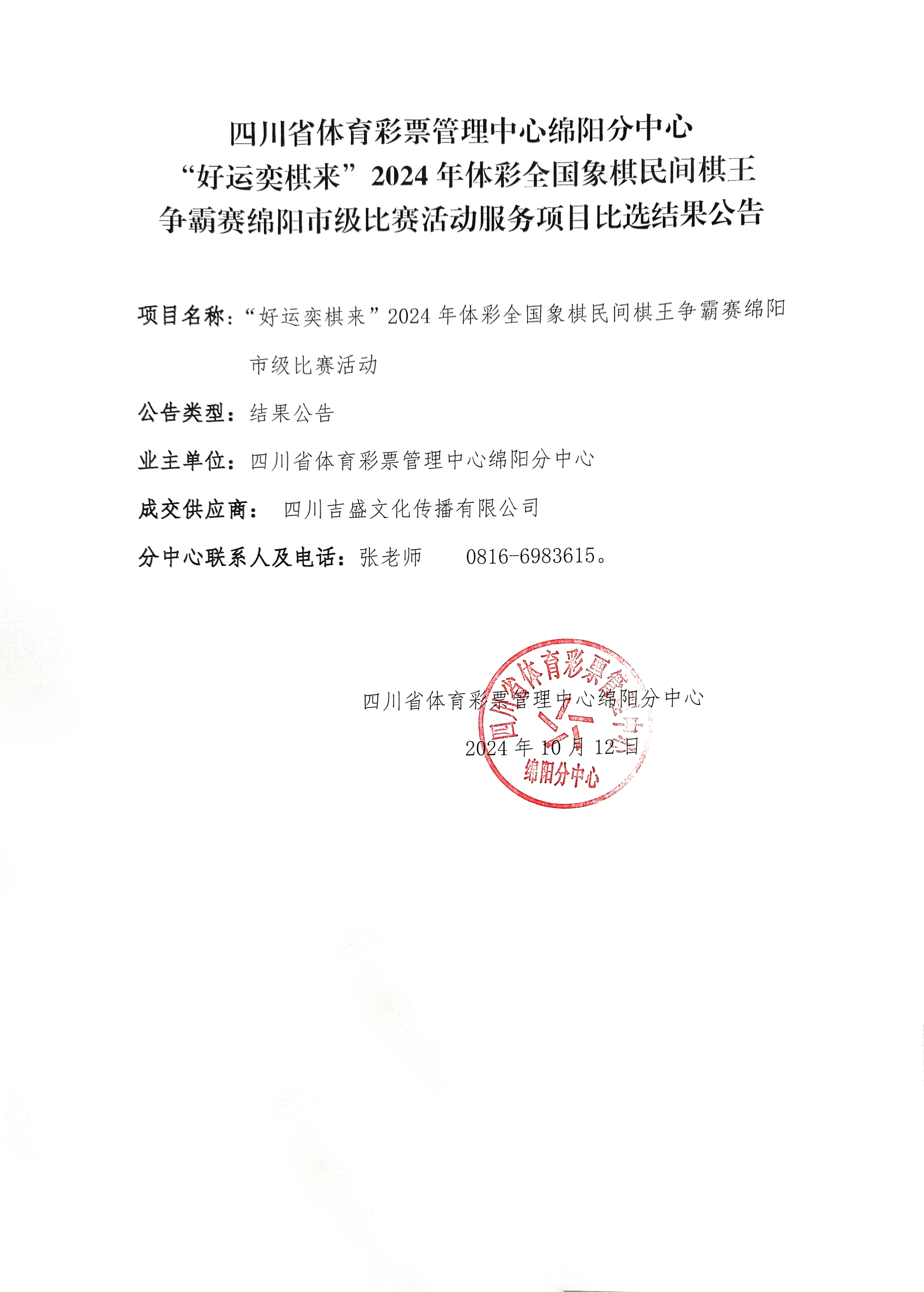 四川省體育彩票管理中心綿陽分中心“好運(yùn)奕棋來”2024年體彩全國象棋民間棋王爭霸賽綿陽市級(jí)比賽活動(dòng)服務(wù)項(xiàng)目比選結(jié)果公告