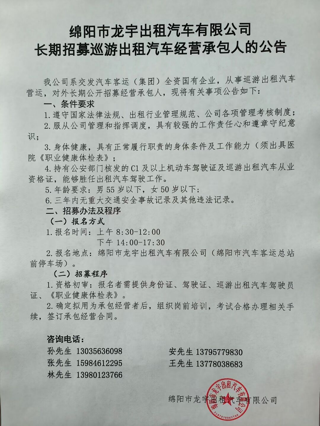 綿陽(yáng)市龍宇出租汽車有限公司長(zhǎng)期招募巡游出租汽車經(jīng)營(yíng)承包人,詳情請(qǐng)致電:13035636098、18281951555