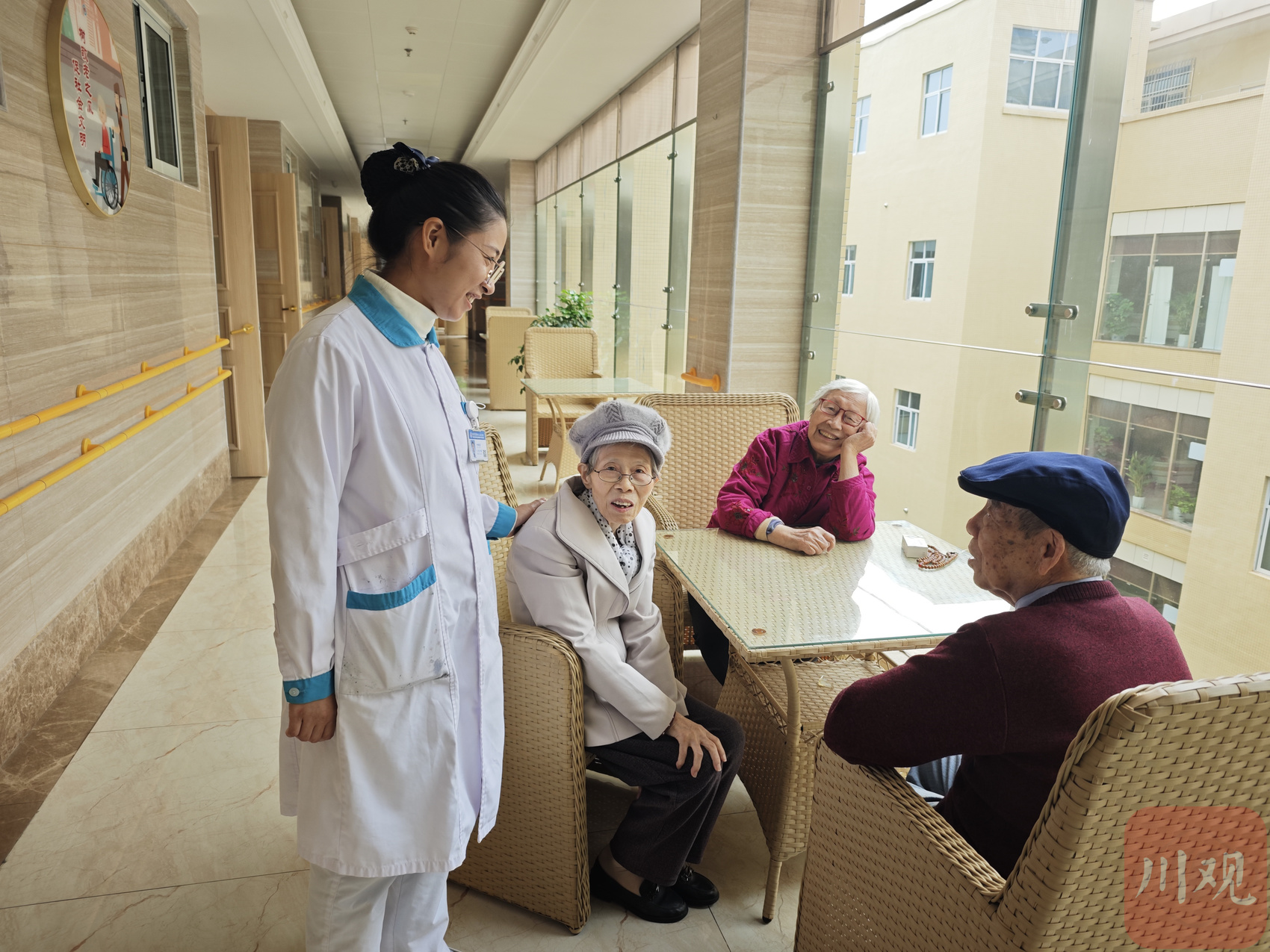 資陽市老年護理院主管護理師舒桃莉正在和老人聊天。資陽觀察 黃芯榕 攝