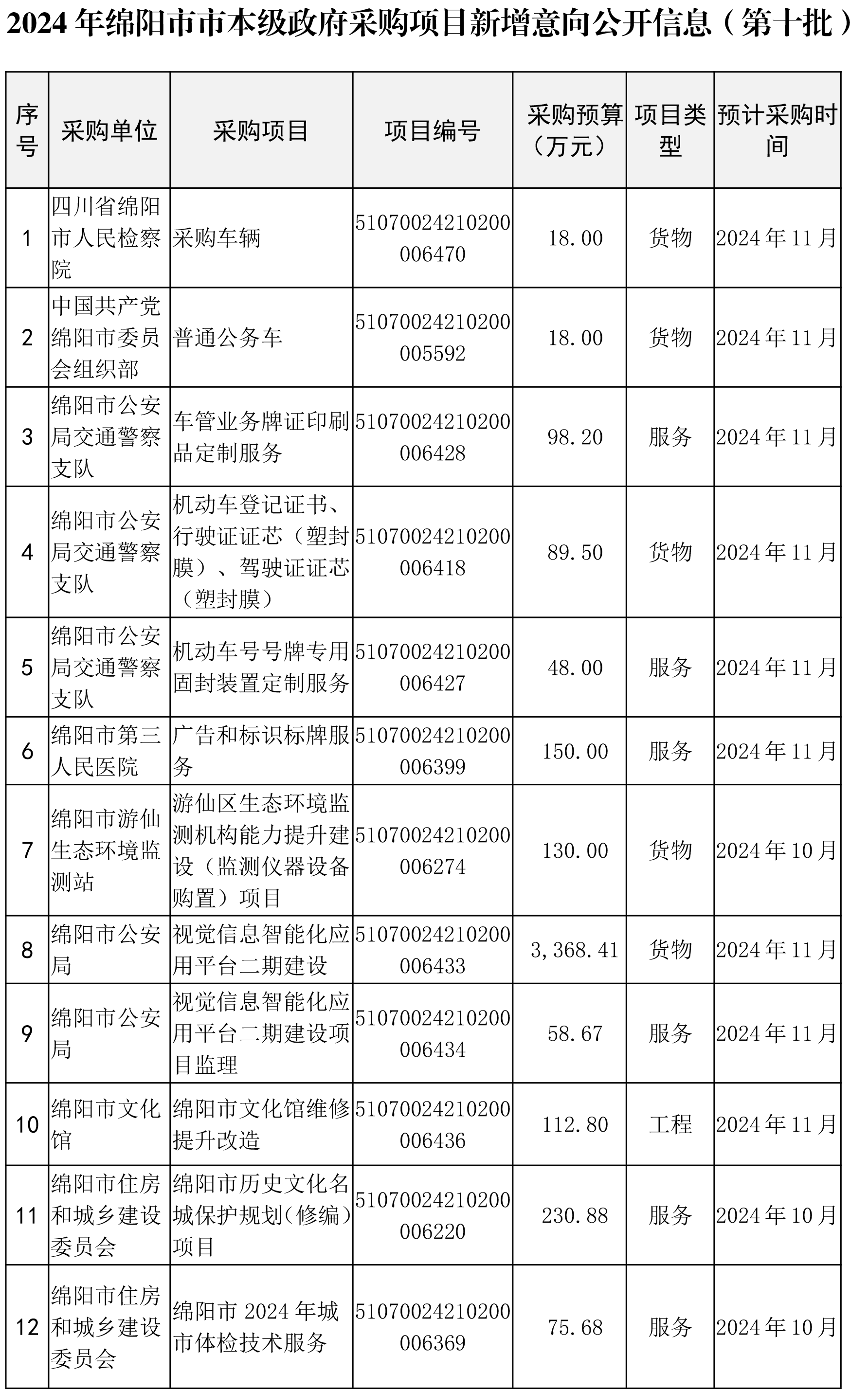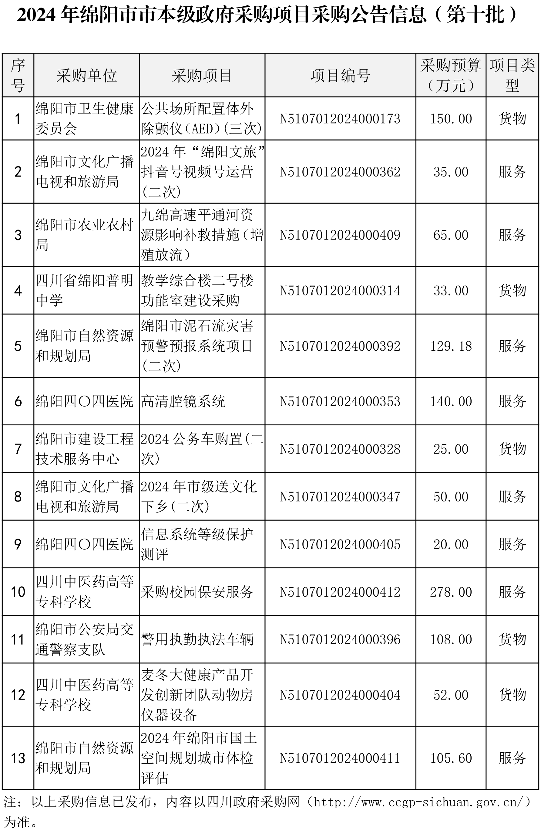 此批綿陽市市本級政府采購項目集中發(fā)布采購公告信息共計13個(于10月14日前已掛網),采購預算金額1190.78萬元,其中:貨物類項目5個,金額368萬元;服務類項目8個,金額822.78萬元。