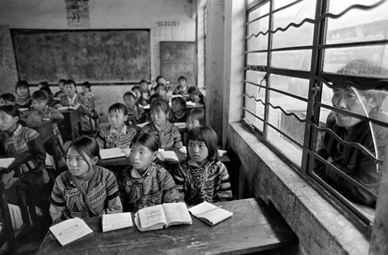 1992年9月,東山鄉(xiāng)中心小學女子班的孩子們正在上課,一位父親透過破粹的玻璃窗看向教室。