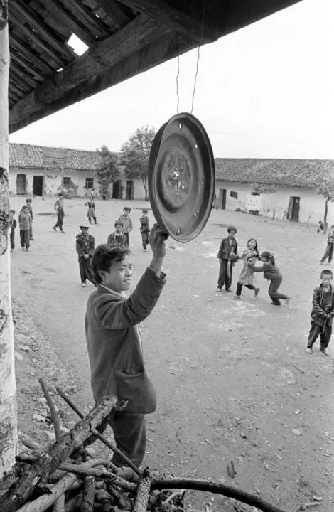 1992年9月的東山鄉(xiāng)中心學校,老師敲擊汽車輪轂代替上課鈴聲。新華社記者陳燮攝