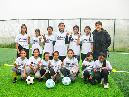 2024年6月19日,國家女足隊員王霜在涼山彝族自治州昭覺縣瓦吾小學與小女足隊員們合影。新華社記者 王曦 攝
