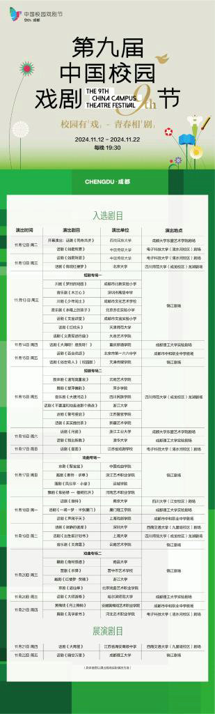 第九屆中國校園戲劇節(jié)將于11月12日至22日在成都舉辦。為進(jìn)一步體現(xiàn)戲劇節(jié)公益性,大部分演出安排在各高校的校內(nèi)劇場(chǎng),并面向社會(huì)招募觀眾。