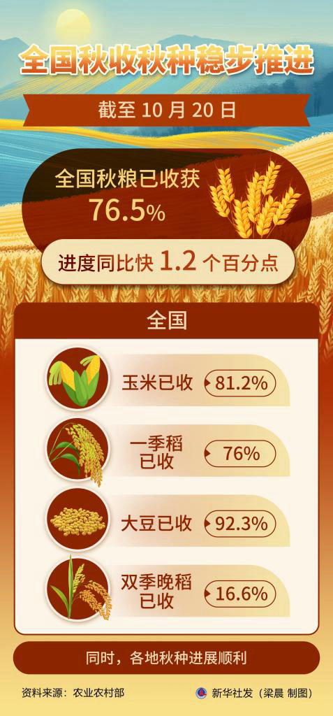 新華社北京10月21日電(記者于文靜)目前,全國(guó)秋收秋種正穩(wěn)步推進(jìn)。截至10月20日,全國(guó)秋糧已收獲76。5%,進(jìn)度同比快1。2個(gè)百分點(diǎn)。