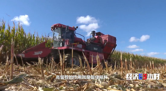合作社負(fù)責(zé)人宮雪告訴記者,收割機的后面就是還田機,現(xiàn)在他們采取了高留茬的“梨樹模式”進(jìn)行秸稈還田,防止大風(fēng)刮走秸稈。