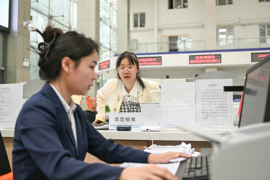 2024年8月12日,在哈爾濱新區(qū)社保綜合服務(wù)大廳,工作人員(左)在辦理業(yè)務(wù)。新華社記者 王松 攝