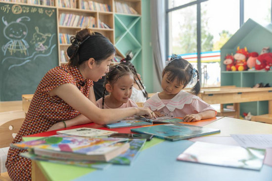 2024年9月25日,在重慶市江津區(qū)珞璜鎮(zhèn)碑亭社區(qū),社區(qū)居民郭明會(huì)(左一)帶著小孩閱讀用社保卡借閱的圖書。新華社記者 黃偉 攝