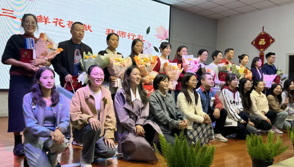 隨后,新教師們滿懷期待地走上臺,他們?yōu)閹煾禍?zhǔn)備了禮物和鮮花,表達著對師傅的敬意。