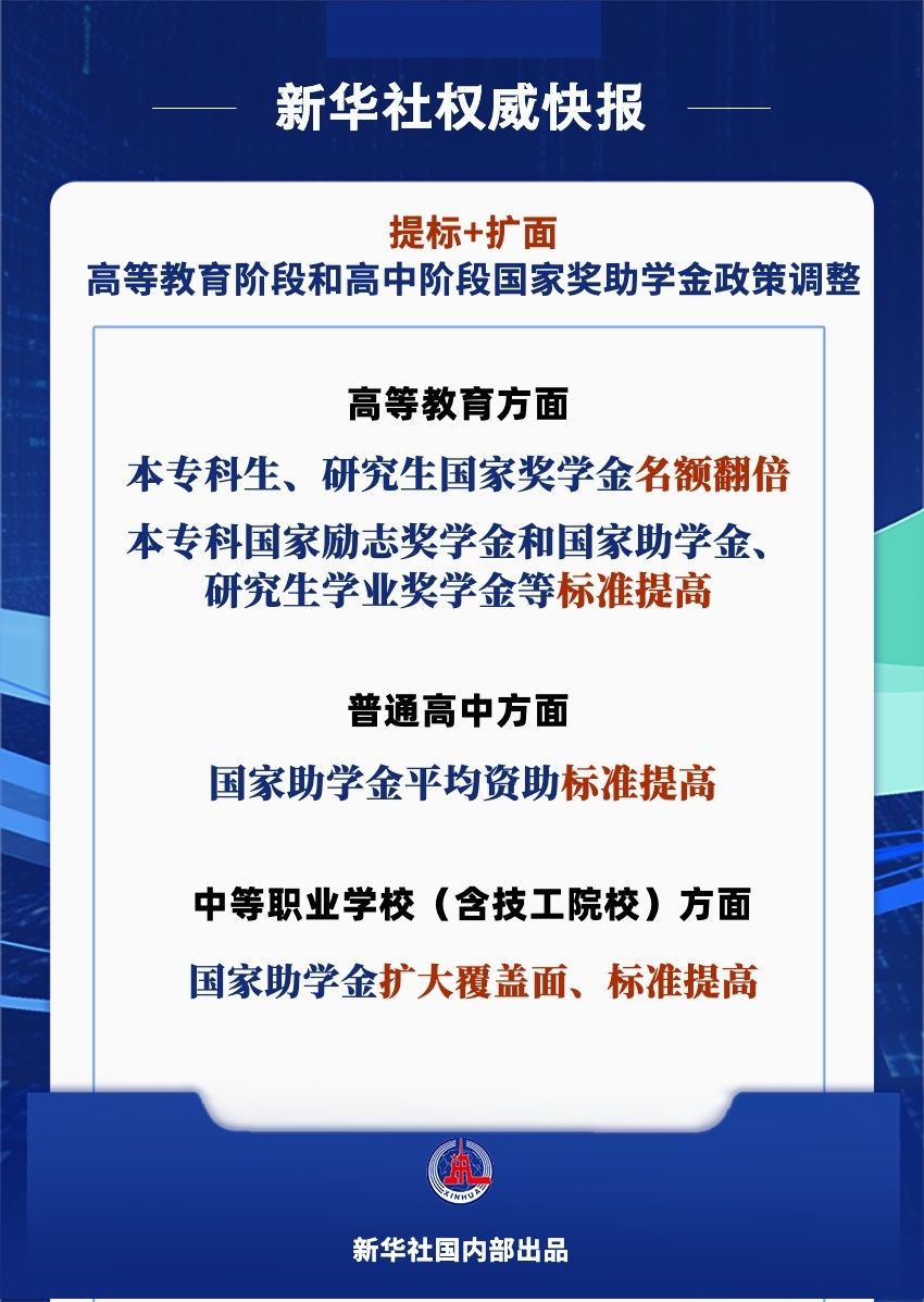 此次學(xué)生資助政策調(diào)整將用更大力度獎優(yōu)助困、更多覆蓋學(xué)生群體,將進(jìn)一步完善覆蓋全學(xué)段學(xué)生資助體系,落實黨中央、國務(wù)院關(guān)于一攬子增量政策有關(guān)部署。