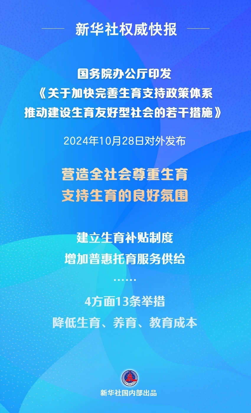 國務(wù)院辦公廳印發(fā)的《關(guān)于加快完善生育支持政策體系推動(dòng)建設(shè)生育友好型社會(huì)的若干措施》2024年10月28日對(duì)外發(fā)布。