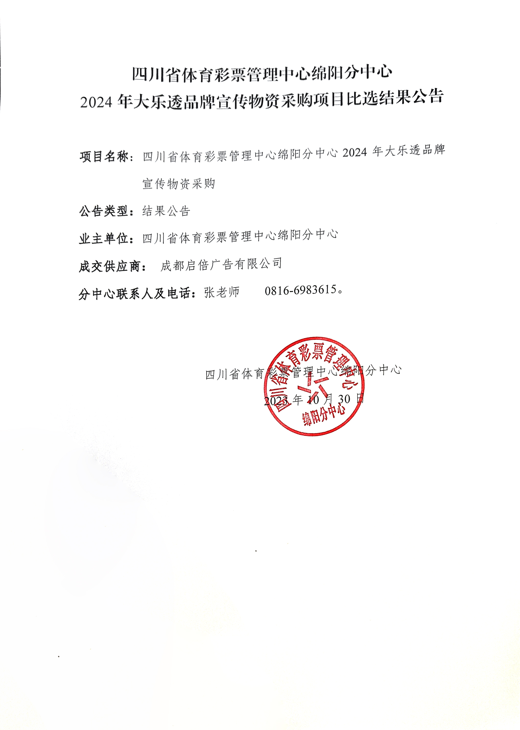 四川省體育彩票管理中心綿陽(yáng)分中心2024年大樂(lè)透品牌宣傳物資采購(gòu)項(xiàng)目比選結(jié)果公告