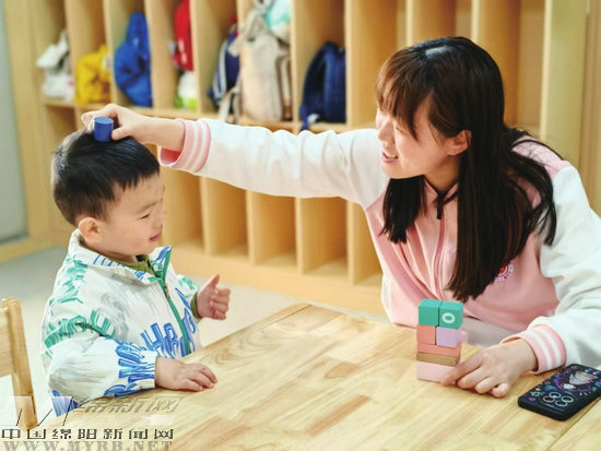 走進(jìn)托育中心,遠(yuǎn)遠(yuǎn)就聽見孩子們的歡笑聲。封閉式院落里,寬敞的戶外活動(dòng)場,幼兒老師正帶領(lǐng)孩子們做游戲;教室里,中班的孩子在老師手把手教導(dǎo)下玩弄各種拼圖、積木;樓上休息室里,保育員正為午睡醒來小班寶寶穿衣服……