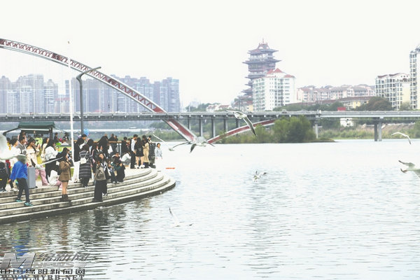11月2日,大量紅嘴鷗在綿陽三江湖碼頭盤旋,與市民親密互動,時而展翅高飛,時而低空掠過人群,時而翩翩起舞,吸引了眾多游客駐足觀看和拍照。紅嘴鷗的到來為綿陽增添了生機與活力,人鳥和諧共處構(gòu)成一道亮麗的風景線。