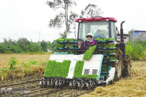 安州區(qū)黃土鎮(zhèn)芋河村,農(nóng)機(jī)手駕駛移栽機(jī)移栽油菜苗