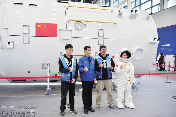 身著太空服的觀眾在空間站模型前打卡(記者王勇攝)