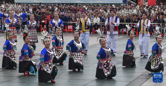 當(dāng)日,湘黔桂三?。▍^(qū))侗族群眾聚集在廣西三江侗族自治縣多耶廣場,載歌載舞,歡慶侗族多耶節(jié)。