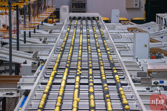 位于資陽(yáng)市安岳縣的四川省維記果品有限公司分揀車間,成千上萬(wàn)顆檸檬正經(jīng)過(guò)智能化分揀線檢測(cè)。