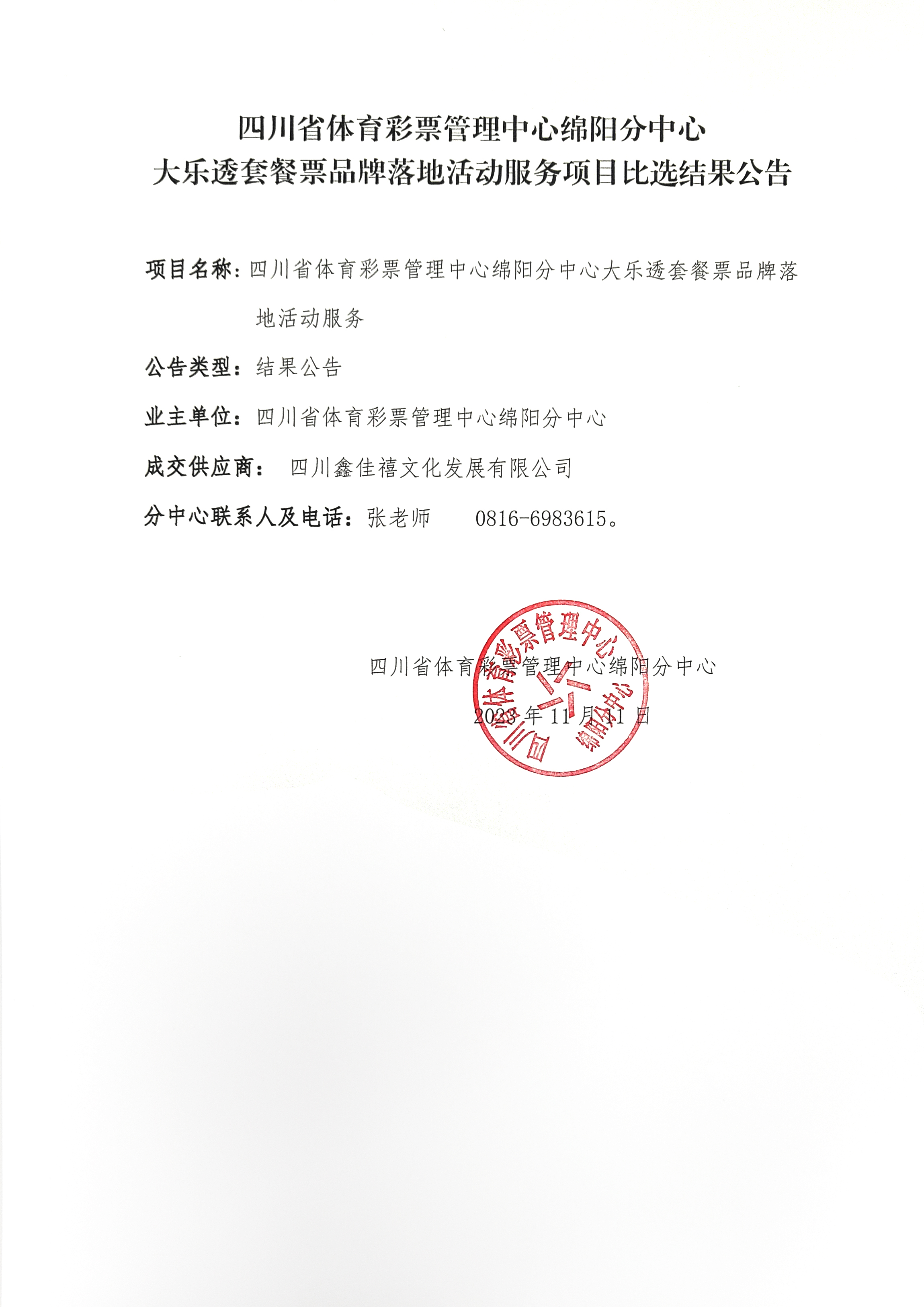 四川省體育彩票管理中心綿陽分中心大樂透套餐票品牌落地活動服務(wù)項(xiàng)日比選結(jié)果公告