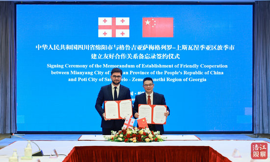 綿陽新聞網(wǎng)訊 11月11日,綿陽市與格魯吉亞波季市簽署建立友好合作關(guān)系備忘錄。綿陽市委副書記、市長李云,波季市市長貝卡·瓦恰拉澤分別代表雙方簽約并致辭,波季市議會主席亞歷山大·特克布查瓦出席并見證簽約。